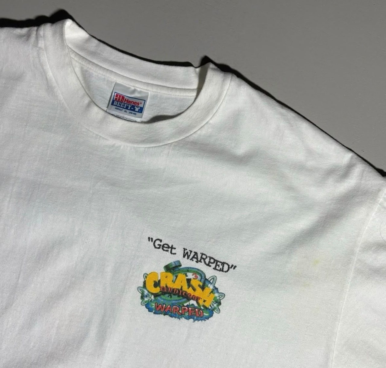 フロントは胸元にゲームタイトルロゴでシンプルな大人っぽさがあり、バックにはインパクト大な大判のイケイケな表情のバンディクーと、妹の天才ココちゃん、そしてクラッシュ3で初登場した子トラのプーラ!